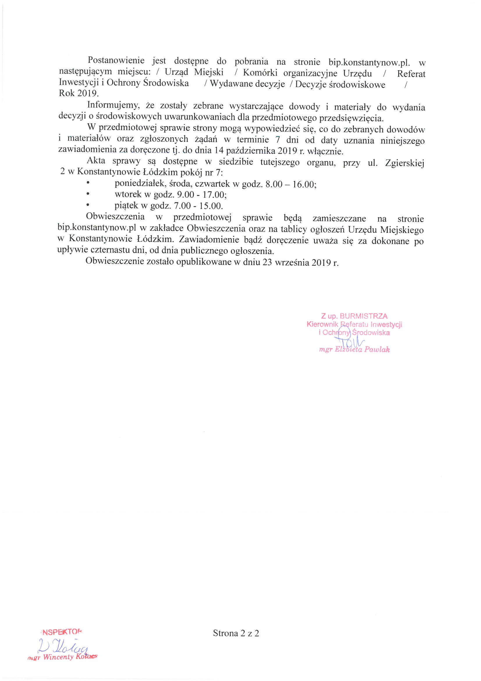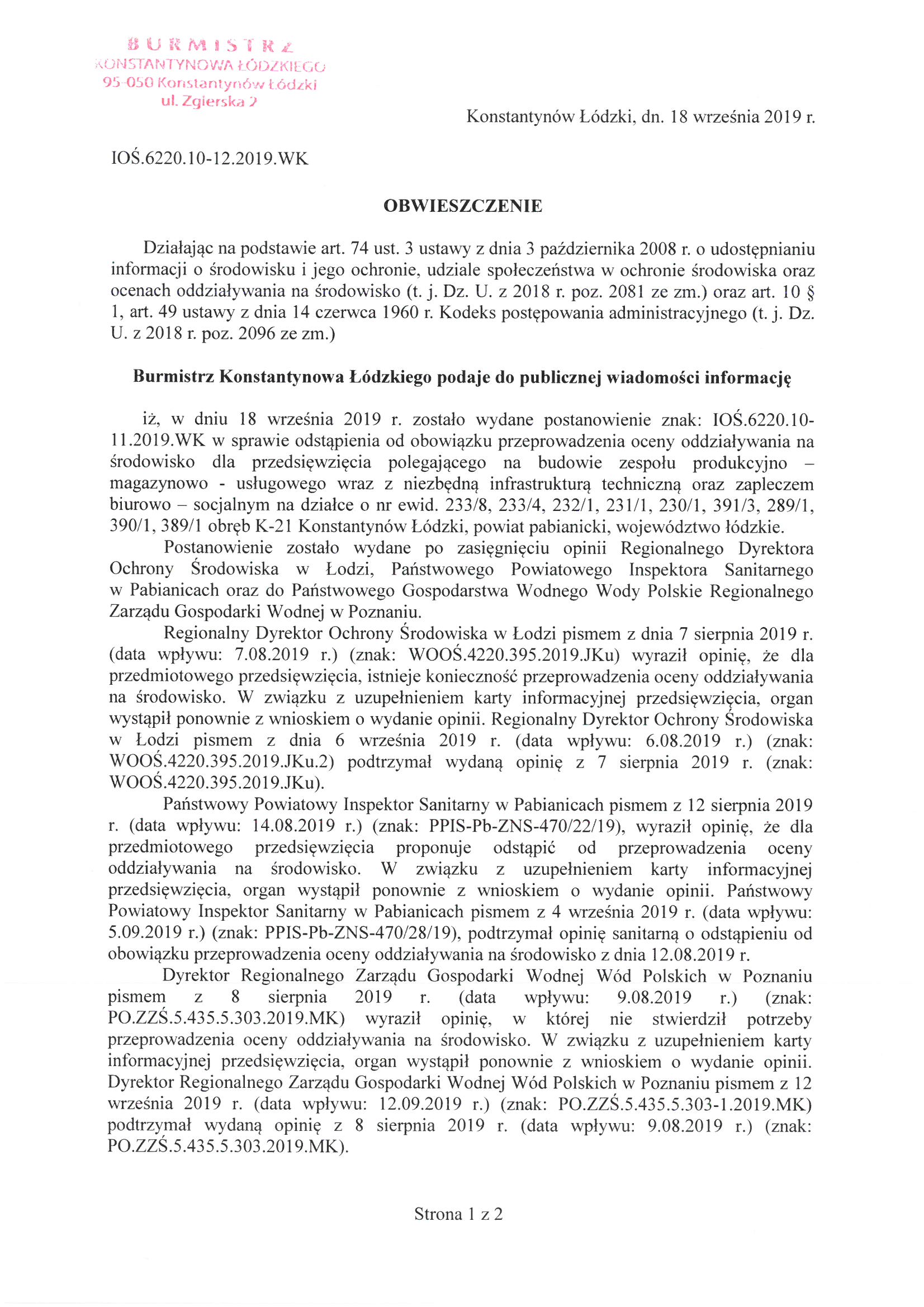Obwieszczenie informujące o wydaniu postanowienia z dnia 18 września 2019 r. znak: IOŚ.6220.10-11.2019.WK odstąpieniu od obowiązku przeprowadzenia oceny oddziaływania na środowisko dla przedsięwzięcia polegającego na budowie zespołu produkcyjno