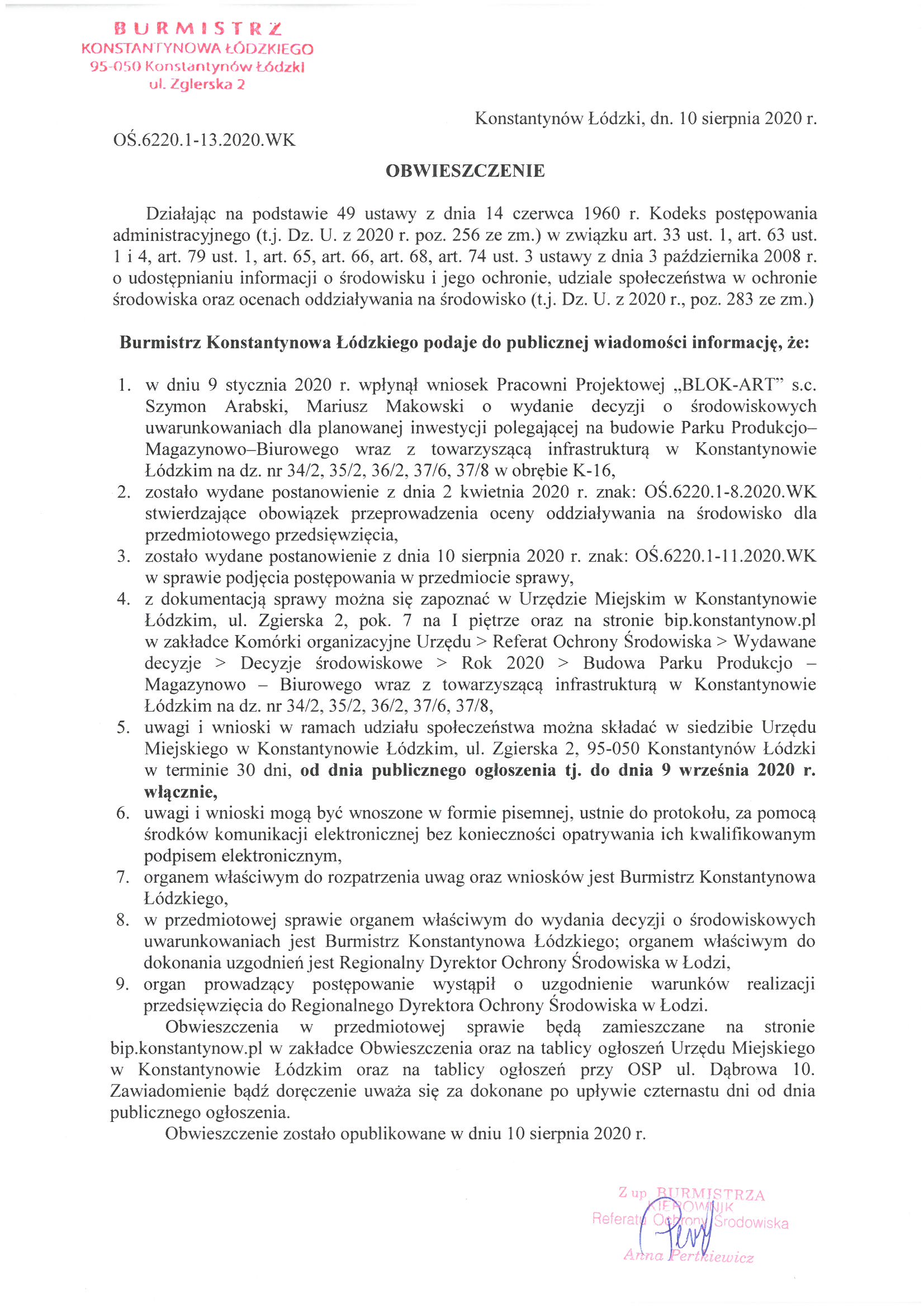 Obwieszczenie informujące o terminie składania uwag i wniosków w ramach udziału społeczeństwa dotyczących przedsięwzięcia polegającego na budowie Parku Produkcjo-Magazynowo-Biurowego wraz z towarzyszącą infrastrukturą w Konstantynowie Ło